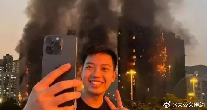 他还在大埔宏福苑火灾现场自拍,大笑并举起胜利手势。